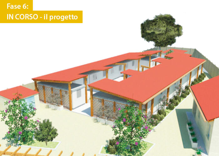 La fase 6, che inizierà a fine Aprile 2022 e prevede: demolizione dei 12 container esistenti, pulitura area - scavo e livellamento. Si avranno quindi 10 nuovi recinti con container annesso + 4 container destinati ai gatti appena arrivati e da controllare e ai cuccioli.